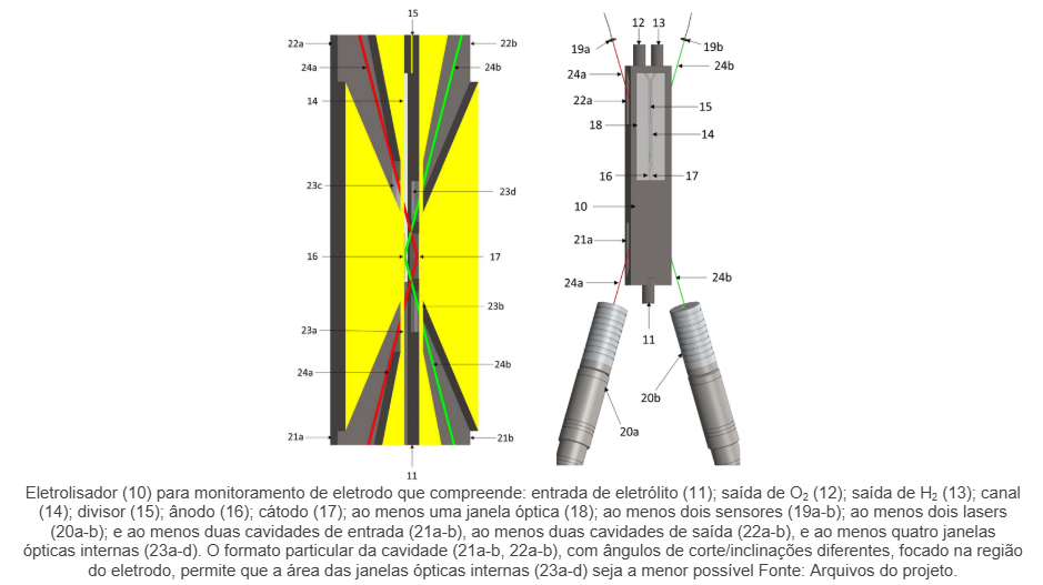 Assim, a presente invenção propõe uma solução inovadora para superar essas barreiras por meio de medições a laser não intrusivas, aumentando a eficiência e a segurança do processo. Este eletrolisador com monitoramento do eletrodo pode ser utilizado para o desenvolvimento e teste de novos materiais de eletrodo, além da análise de como o eletrólito e o escoamento contribuem para a limpeza da superfície eletroquímica durante a operação.